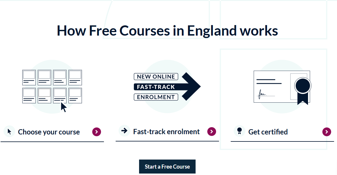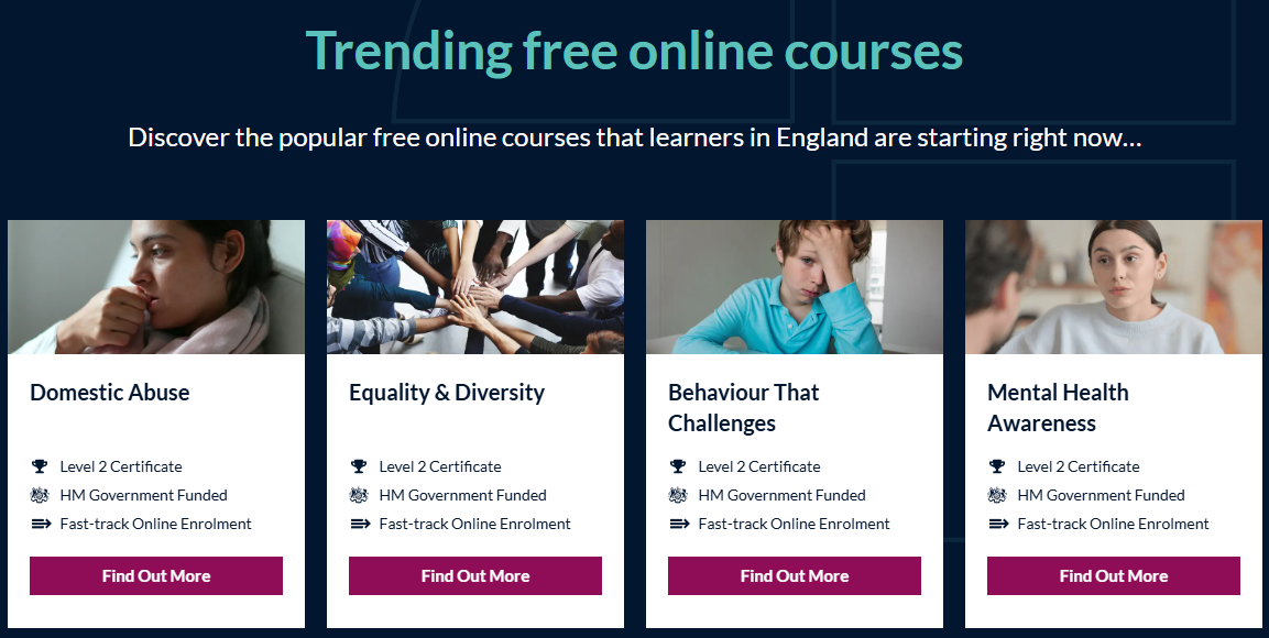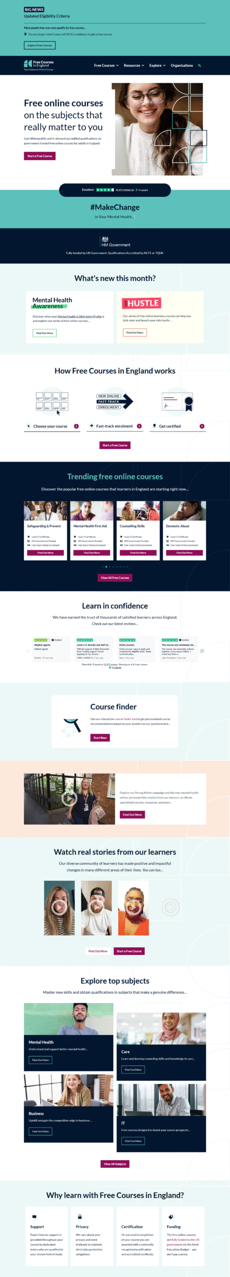 Free Courses in England is a platform that offers fully funded, accredited courses for adults in England. It provides over 70 flexible free courses across subjects like mental health, business, IT, health & social care, teaching, and wellbeing. The site is designed for accessibility and ease of use, with features such as course finder tools, eligibility checks, fully funded certification, and intuitive navigation to help learners find and start free courses quickly.