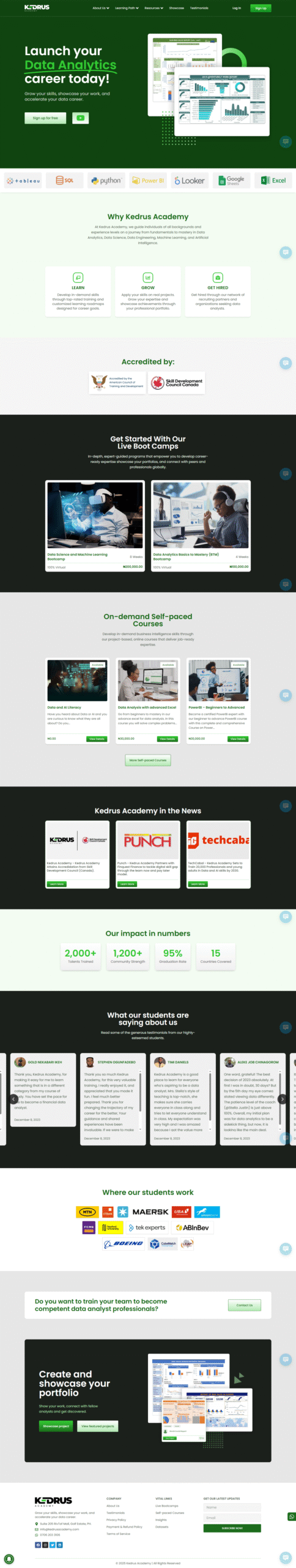 Kedrus Academy is an advanced eLearning platform specializing in Data Science, Machine Learning, and Artificial Intelligence education. The website was designed to support both Live Bootcamps and Self-paced Courses, while also offering access to datasets, insights, and a student showcase. The primary goal was to create a professional, user-friendly, and conversion-focused website that delivers a seamless learning experience across all devices.