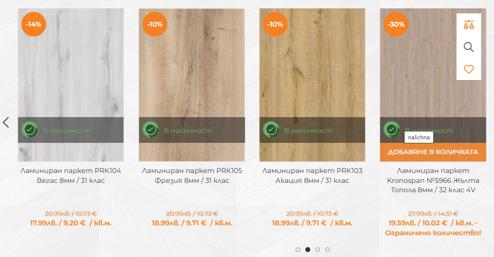 Parketensviat is a Bulgarian online store specializing in flooring solutions (laminate, vinyl, hardwood, hybrid floors, wall panels, etc.). The site needed to present a large catalog of flooring products with filters, comparison tools, a polished design aesthetic, and smooth user experience. The goal was to merge visual appeal and functionality: highlight product details, promotional offers, and help customers make informed purchase decisions with ease.